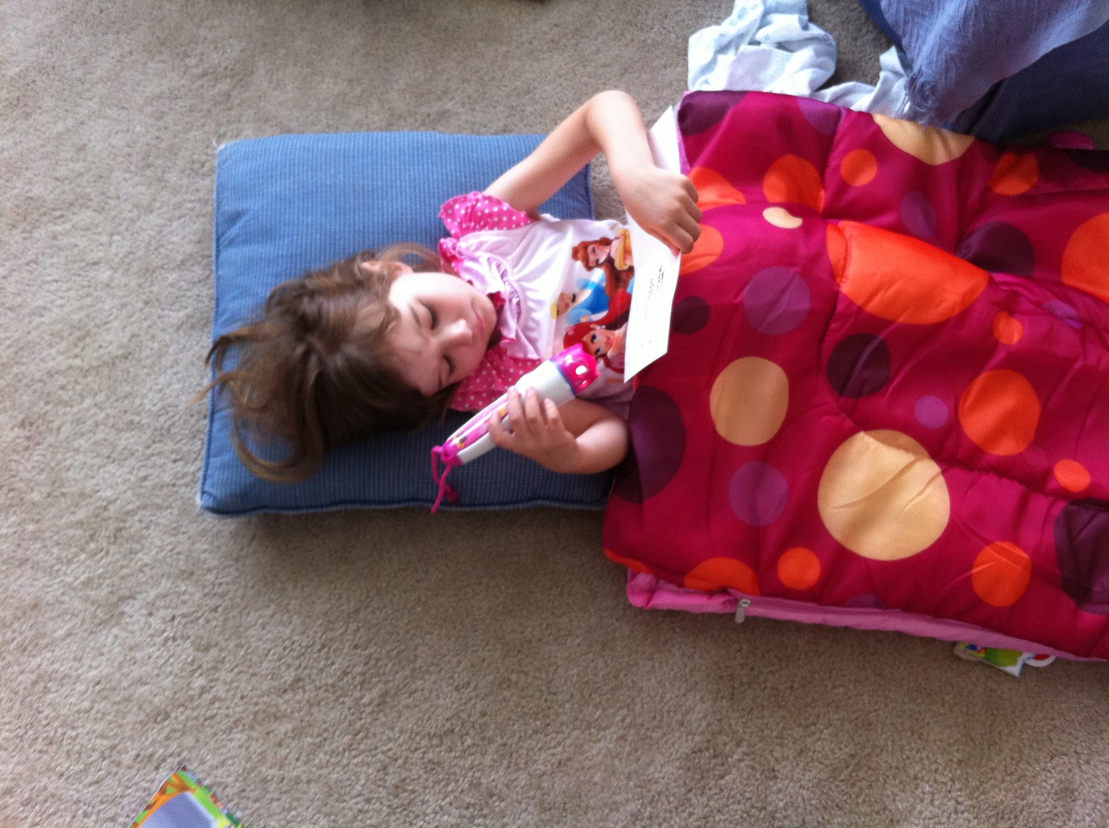 After we got the sleeping bag we asked Alyce if she wanted to go camping outside. She said no and that she wanted to go camping in her room instead.